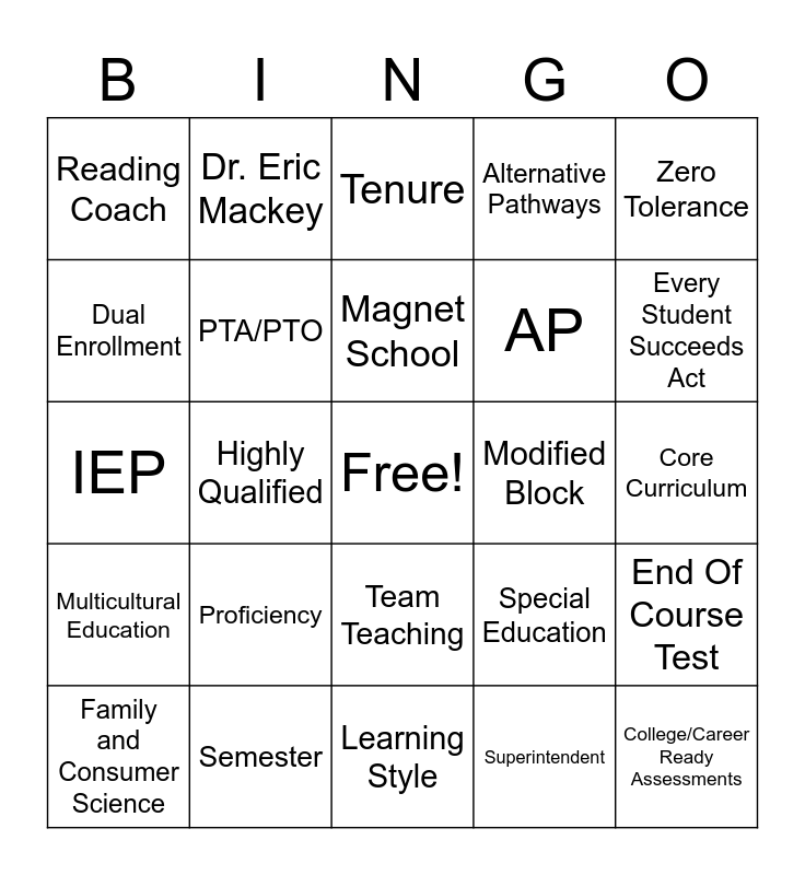 This bingo card has a free space and 24 words: Proficiency, Semester, Magnet School, Family and Consumer Science, Zero Tolerance, Reading Coach, Dual Enrollment, Dr. Eric Mackey, Modified Block, Team Teaching, AP, IEP, Special Education, End Of Course Test, PTA/PTO, Superintendent, Core Curriculum, Tenure, Every Student Succeeds Act, Highly Qualified, College/Career Ready Assessments, Multicultural Education, Alternative Pathways and Learning Style.