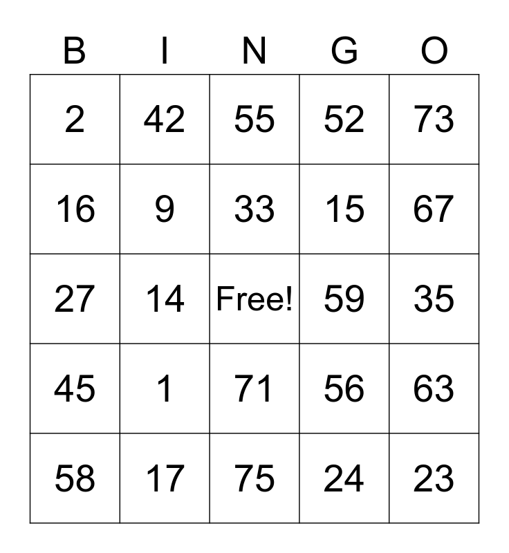 This bingo card has a free space and 24 words: 1, 17, 33, 58, 73, 2, 16, 42, 59, 71, 15, 27, 56, 63, 9, 24, 35, 55, 67, 14, 23, 45, 52 and 75.