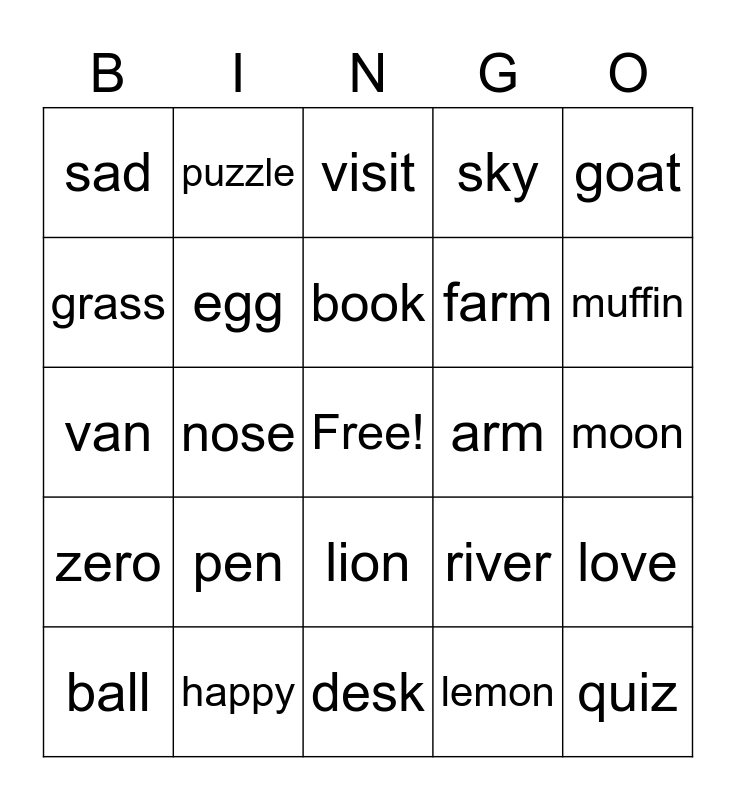 This bingo card has a free space and 24 words: pen, happy, book, ball, goat, sad, grass, puzzle, arm, lion, farm, van, river, love, egg, lemon, moon, visit, muffin, nose, quiz, zero, sky and desk.