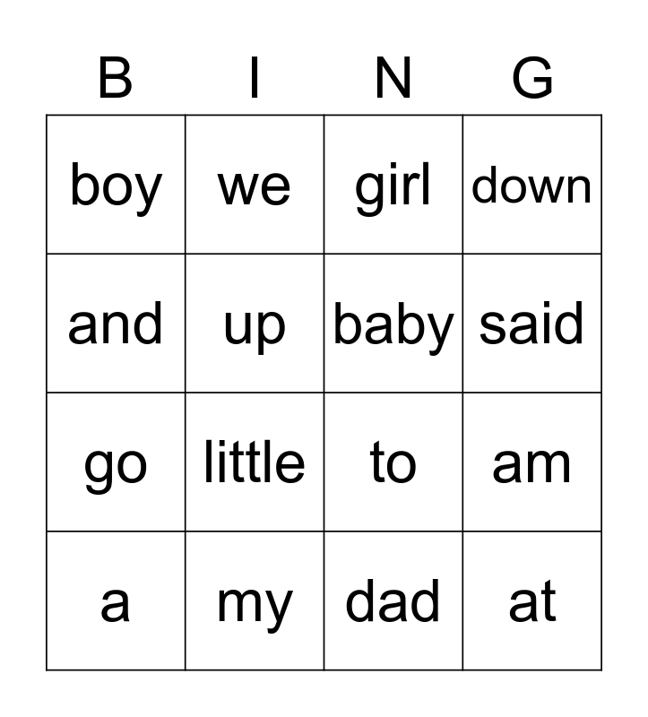This bingo card has 31 words: Free!, I, am, a, boy, girl, baby, the, my, mum, dad, a, is, as, little, big, look, be, at, come, and, see, can, we, go, up, down, to, here, said and in.