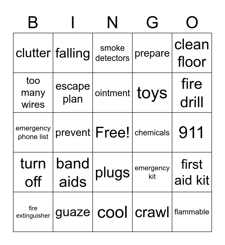 This bingo card has a free space and 24 words: band aids, guaze, ointment, fire extinguisher, clean floor, clutter, too many wires, falling, chemicals, plugs, toys, emergency phone list, emergency kit, first aid kit, escape plan, crawl, 911, smoke detectors, fire drill, prevent, flammable, turn off, prepare and cool.