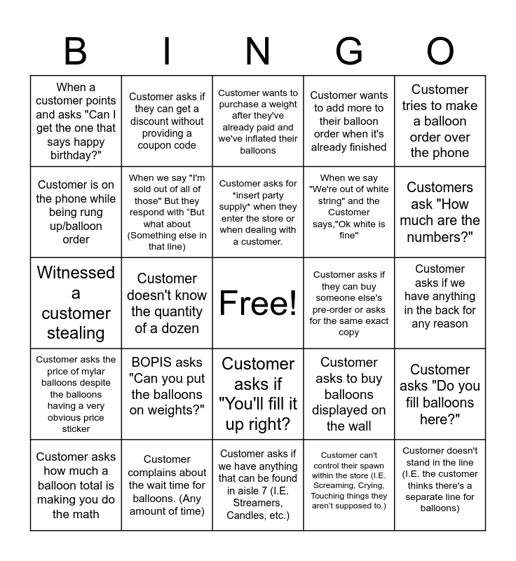 This bingo card has a free space and 24 words: BOPIS asks "Can you put the balloons on weights?", Customer complains about the wait time for balloons. (Any amount of time), Customer asks for *insert party supply* when they enter the store or when dealing with a customer., Customer asks how much a balloon total is making you do the math, Customer tries to make a balloon order over the phone, When a customer points and asks "Can I get the one that says happy birthday?", Customer is on the phone while being rung up/balloon order, Customer asks if they can get a discount without providing a coupon code, Customer asks if they can buy someone else's pre-order or asks for the same exact copy, Customer asks if "You'll fill it up right?, When we say "We're out of white string" and the Customer says,"Ok white is fine", Witnessed a customer stealing, Customer asks to buy balloons displayed on the wall, Customer asks "Do you fill balloons here?", When we say "I'm sold out of all of those" But they respond with “But what about (Something else in that line), Customer can't control their spawn within the store (I.E. Screaming, Crying, Touching things they aren’t supposed to.), Customer asks if we have anything in the back for any reason, Customer wants to purchase a weight after they've already paid and we've inflated their balloons, Customers ask "How much are the numbers?", Customer doesn't know the quantity of a dozen, Customer doesn't stand in the line (I.E. the customer thinks there's a separate line for balloons), Customer asks the price of mylar balloons despite the balloons having a very obvious price sticker, Customer wants to add more to their balloon order when it's already finished and Customer asks if we have anything that can be found in aisle 7 (I.E. Streamers, Candles, etc.).