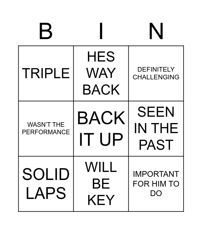 This bingo card has 9 words: SOLID LAPS, DEFINITELY CHALLENGING, HES WAY BACK, WASN’T THE PERFORMANCE, TRIPLE, SEEN IN THE PAST, BACK IT UP, IMPORTANT FOR HIM TO DO and WILL BE KEY.