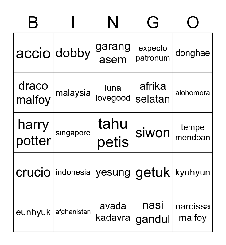 This bingo card has a free space and 24 words: indonesia, afghanistan, luna lovegood, eunhyuk, donghae, accio, draco malfoy, dobby, siwon, yesung, afrika selatan, harry potter, getuk, kyuhyun, malaysia, nasi gandul, tempe mendoan, garang asem, alohomora, singapore, narcissa malfoy, crucio, expecto patronum and avada kadavra.
