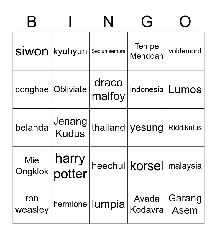 This bingo card has a free space and 24 words: harry potter, hermione, draco malfoy, ron weasley, voldemord, siwon, donghae, kyuhyun, yesung, heechul, indonesia, belanda, korsel, malaysia, Obliviate, Avada Kedavra, Riddikulus, Sectumsempra, Lumos, Jenang Kudus, Garang Asem, Mie Ongklok, Tempe Mendoan and lumpia.