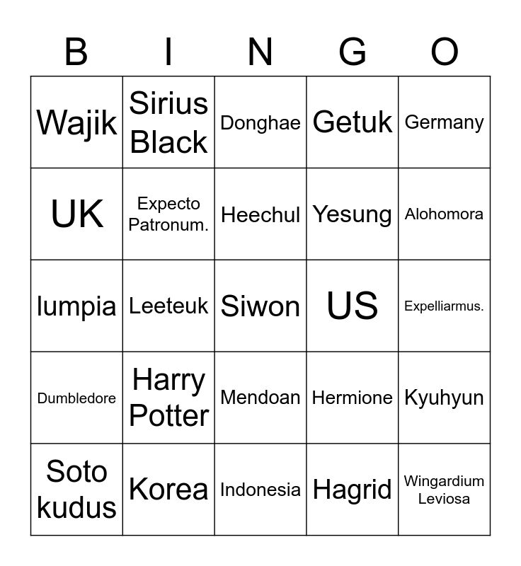 This bingo card has a free space and 24 words: Harry Potter, Korea, Heechul, Soto kudus, Germany, Wajik, UK, Sirius Black, US, Mendoan, Yesung, lumpia, Hermione, Kyuhyun, Expecto Patronum., Hagrid, Expelliarmus., Donghae, Alohomora, Leeteuk, Wingardium Leviosa, Dumbledore, Getuk and Indonesia.