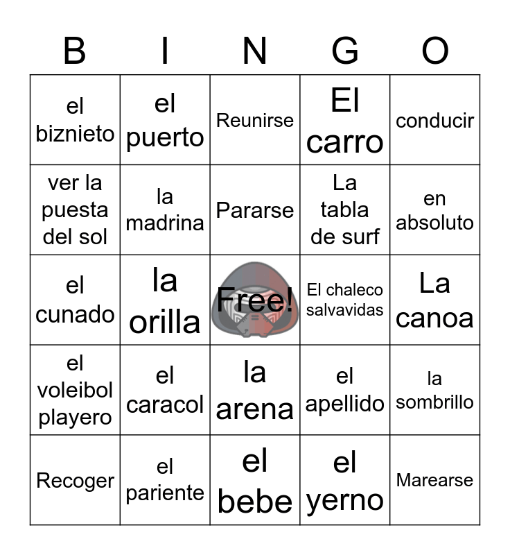 This bingo card has a free space and 24 words: el caracol, el pariente, Pararse, Recoger, conducir, el biznieto, ver la puesta del sol, el puerto, El chaleco salvavidas, la arena, La tabla de surf, el cunado, el apellido, la sombrillo, la madrina, el yerno, La canoa, Reunirse, en absoluto, la orilla, Marearse, el voleibol playero, El carro and el bebe.