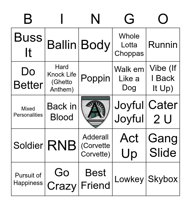 This bingo card has a free space and 56 words: Melodies From Heaven, Pursuit of Happiness, Shawty, Buss It, Best Friend, Dreams & Nightmares, Hard Knock Life (Ghetto Anthem), On Me, Walk em Like a Dog, Crazy Story 2.0, Whole Lotta Choppas, Juke Jam, Pick Up Your Feelings, 3 Headed Goat, For the Night, Lemonade, Runnin, Back in Blood, Mood Swings, Skybox, Joyful Joyful, On Chill, Act Up, Body, Where the Party At, Poppin, Faneto, Hit Em Up, Vibe (If I Back It Up), Hot Now, Old Town Road, Get Paid, Friendly, Titanic, Cater 2 U, Do Better, Mixed Personalities, Worth It, Soldier, Ballin, Adderall (Corvette Corvette), Make No Sense, Nights Like This, War Baby, Out West, RNB, Go Crazy, Back That Azz Up, Please Me, Make No Sense, Lowkey, Hands on ya Knees, Said Sum (Remix), Laugh Now Cry Later, Gang Slide and How Do U Want It.
