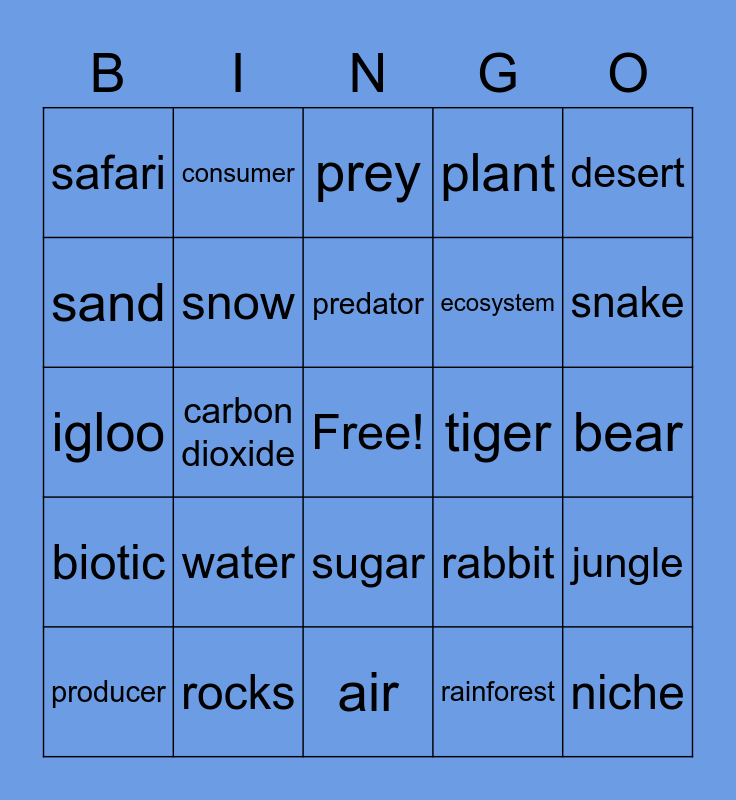 This bingo card has a free space and 24 words: producer, water, predator, rainforest, desert, safari, consumer, prey, tiger, bear, igloo, snow, rabbit, jungle, sand, rocks, air, plant, snake, biotic, carbon dioxide, sugar, ecosystem and niche.
