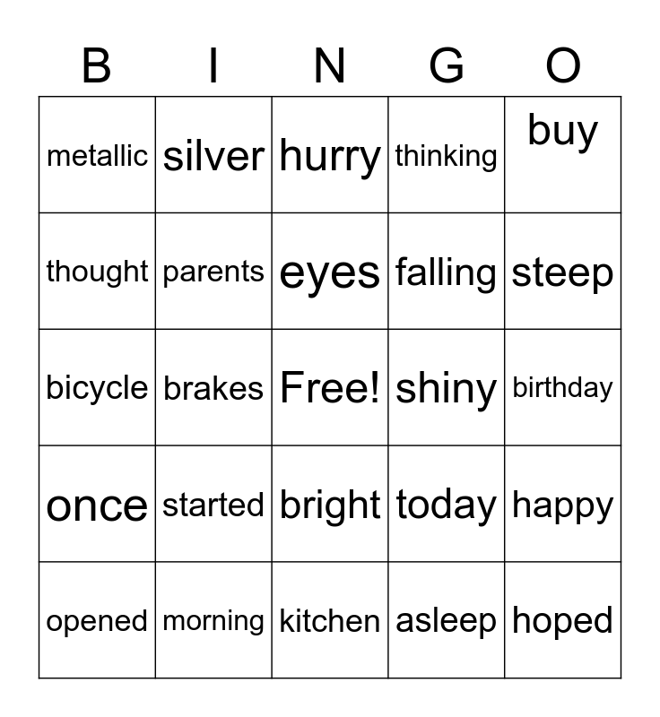 This bingo card has a free space and 24 words: started, morning, eyes, opened, buy, metallic, thought, silver, shiny, bright, falling, bicycle, today, happy, parents, asleep, birthday, hurry, steep, brakes, hoped, once, thinking and kitchen.
