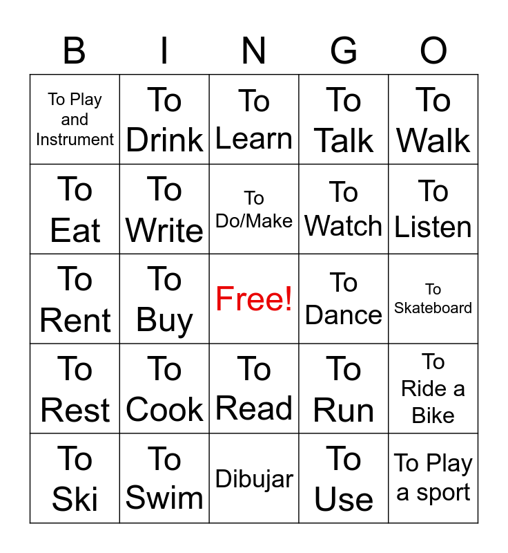 This bingo card has a free space and 24 words: To Cook, To Swim, To Do/Make, To Ski, To Walk, To Play and Instrument, To Eat, To Drink, To Dance, To Read, To Watch, To Rent, To Run, To Ride a Bike, To Write, To Use, To Skateboard, To Learn, To Listen, To Buy, To Play a sport, To Rest, To Talk and Dibujar.