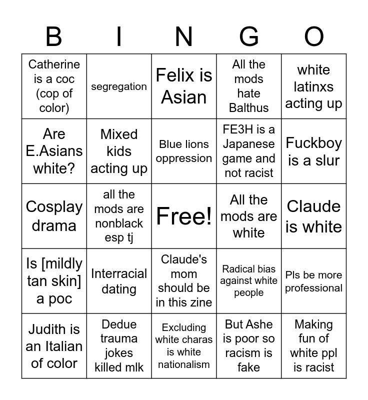 This bingo card has a free space and 24 words: Interracial dating, Dedue trauma jokes killed mlk, Blue lions oppression, Judith is an Italian of color, white latinxs acting up, Catherine is a coc (cop of color), Are E.Asians white?, segregation, All the mods are white, Claude's mom should be in this zine, FE3H is a Japanese game and not racist, Cosplay drama, Radical bias against white people, Pls be more professional, Mixed kids acting up, But Ashe is poor so racism is fake, Claude is white, Felix is Asian, Fuckboy is a slur, all the mods are nonblack esp tj, Making fun of white ppl is racist, Is [mildly tan skin] a poc, All the mods hate Balthus and Excluding white charas is white nationalism.