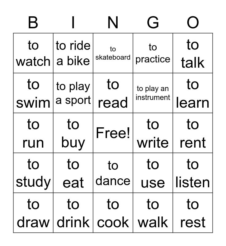 This bingo card has a free space and 24 words: to eat, to drink, to read, to draw, to talk, to watch, to swim, to ride a bike, to write, to dance, to play an instrument, to run, to use, to listen, to play a sport, to walk, to rent, to skateboard, to learn, to buy, to rest, to study, to practice and to cook.