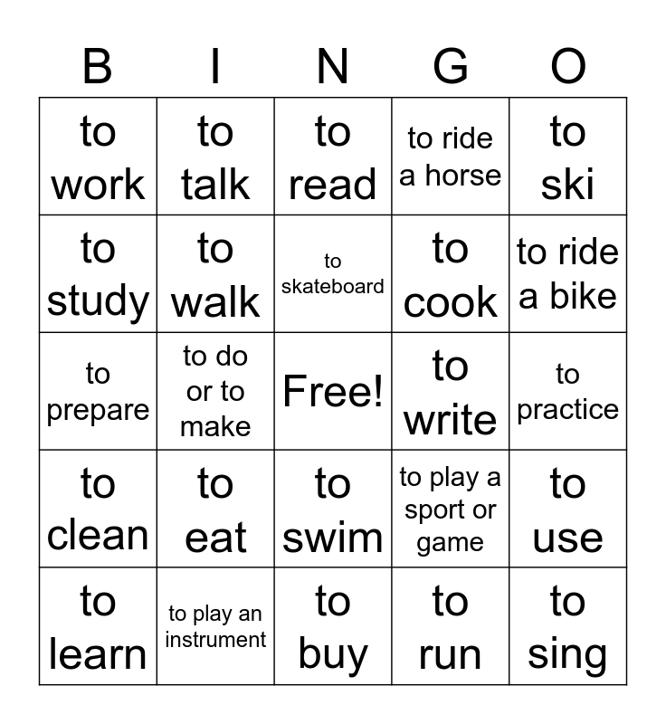 This bingo card has a free space and 24 words: to eat, to play an instrument, to skateboard, to learn, to ski, to work, to study, to talk, to write, to swim, to cook, to prepare, to play a sport or game, to use, to walk, to run, to practice, to read, to ride a bike, to do or to make, to sing, to clean, to ride a horse and to buy.