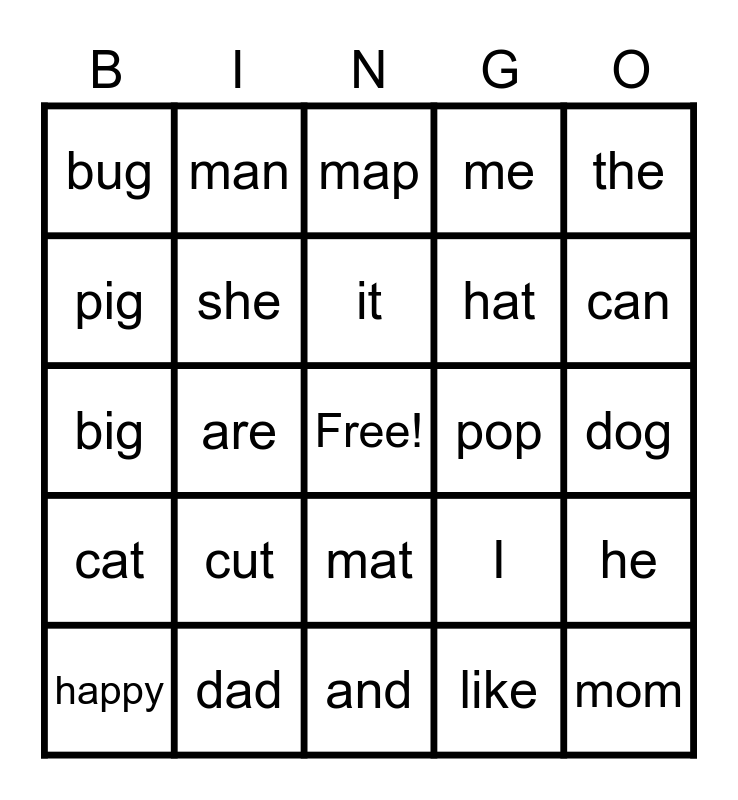 This bingo card has a free space and 25 words: cut, and, it, happy, the, bug, pig, man, pop, mat, hat, big, I, he, she, ten, dog, map, can, are, mom, dad, cat, me and like.
