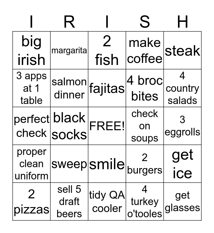 This bingo card has a free space and 24 words: sweep, sell 5 draft beers, fajitas, 2 pizzas, steak, big irish, 3 apps at 1 table, margarita, check on soups, smile, 4 broc bites, perfect check, 2 burgers, get ice, salmon dinner, 4 turkey o'tooles, 3 eggrolls, 2 fish, 4 country salads, black socks, get glasses, proper clean uniform, make coffee and tidy QA cooler.