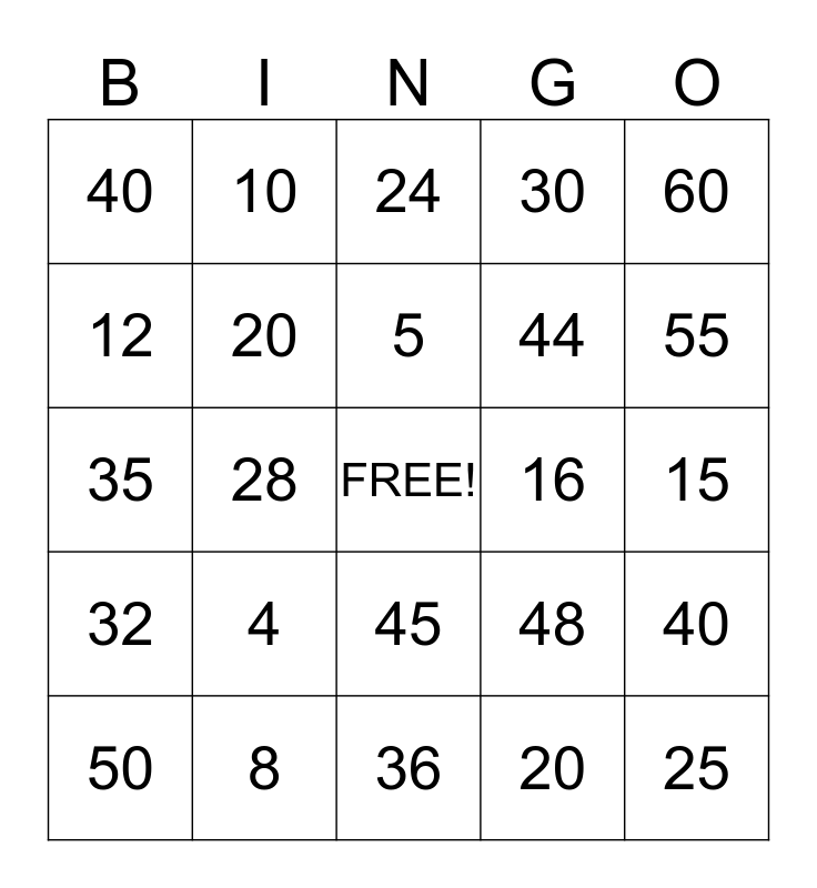 This bingo card has a free space and 24 words: 4, 8, 5, 50, 60, 40, 12, 10, 16, 45, 44, 35, 48, 40, 20, 20, 15, 24, 55, 28, 25, 32, 30 and 36.