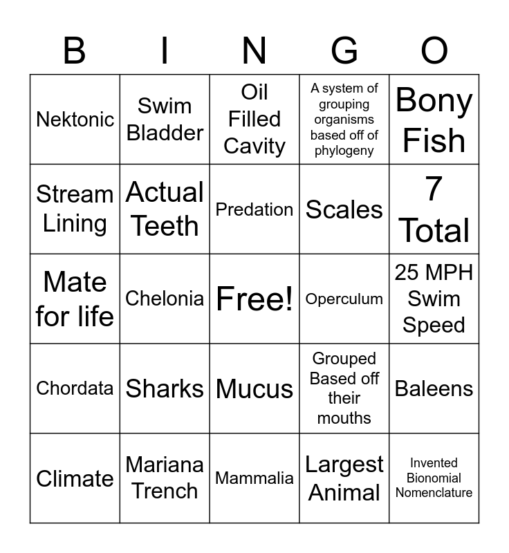 This bingo card has a free space and 24 words: Sharks, Mariana Trench, Predation, Climate, Bony Fish, Nektonic, Stream Lining, Swim Bladder, Operculum, Mucus, Scales, Mate for life, Grouped Based off their mouths, Baleens, Actual Teeth, Largest Animal, 25 MPH Swim Speed, Oil Filled Cavity, 7 Total, Chelonia, Invented Bionomial Nomenclature, Chordata, A system of grouping organisms based off of phylogeny and Mammalia.