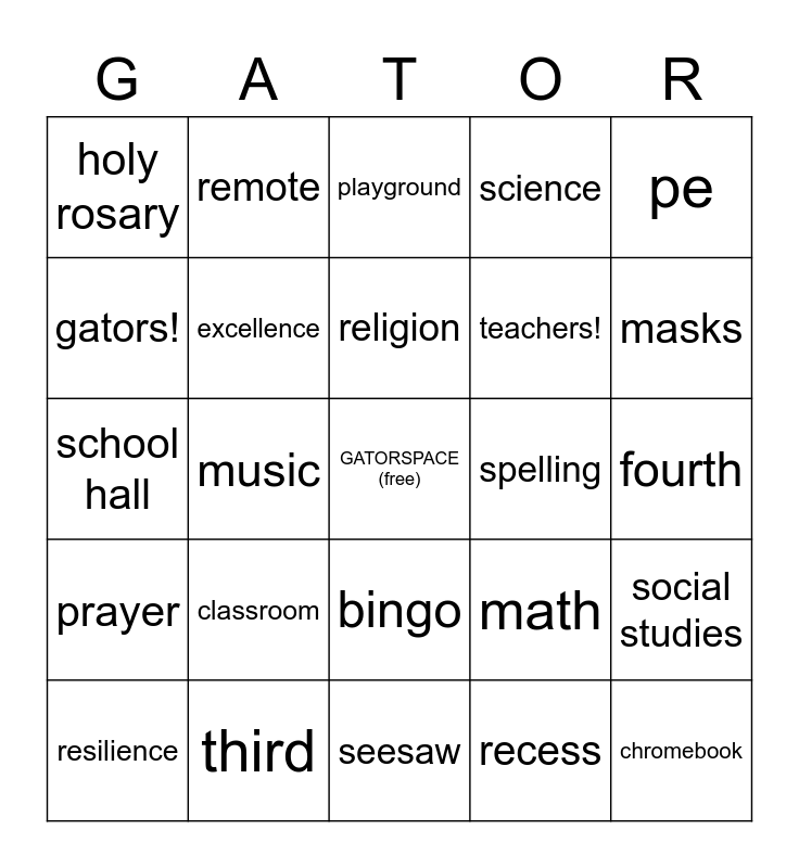This bingo card has a free space and 46 words: zoom, chromebook, ipad, seesaw, classroom, google, remote, connected, gators!, spirit, excellence, science, social studies, math, reading, la, religion, spelling, spanish, pe, music, recess, holy rosary, teachers!, safe, masks, resilience, respectful, bingo, prayer, big toy, lanigan gym, kindergarten, first, second, third, fourth, fifth, sixth, seventh, eighth, playground, school hall, mrs. horton, father oakland and church.