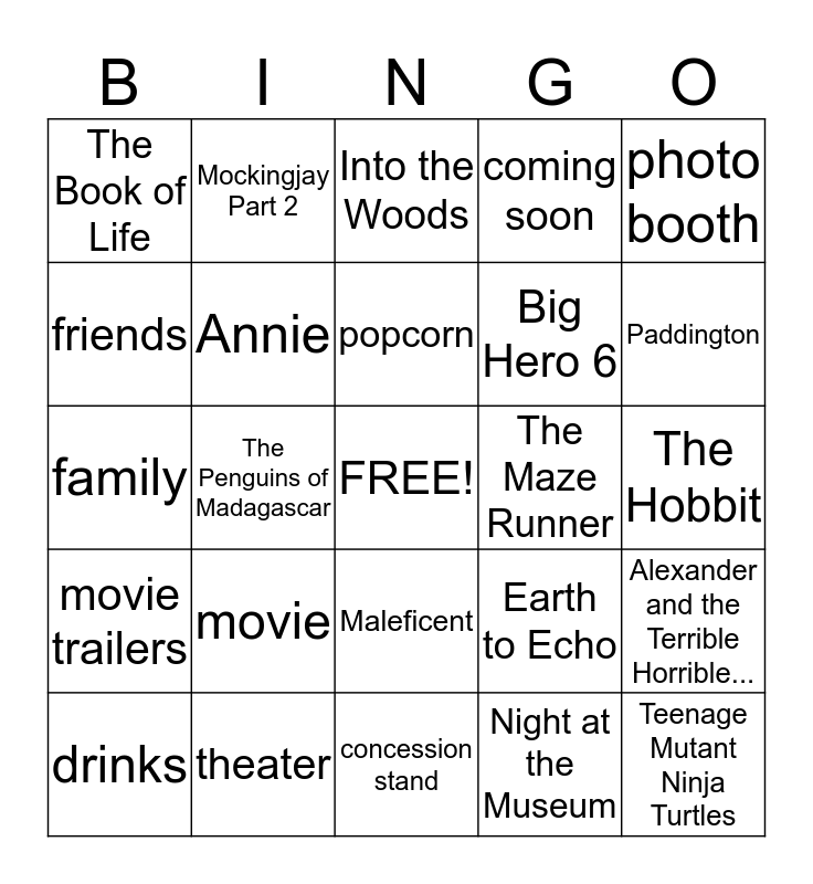 This bingo card has a free space and 24 words: movie, theater, popcorn, drinks, photo booth, The Book of Life, friends, Mockingjay Part 2, The Maze Runner, Maleficent, Big Hero 6, family, Earth to Echo, Alexander and the Terrible Horrible..., Annie, Night at the Museum, The Hobbit, Into the Woods, Paddington, The Penguins of Madagascar, Teenage Mutant Ninja Turtles, movie trailers, coming soon and concession stand.