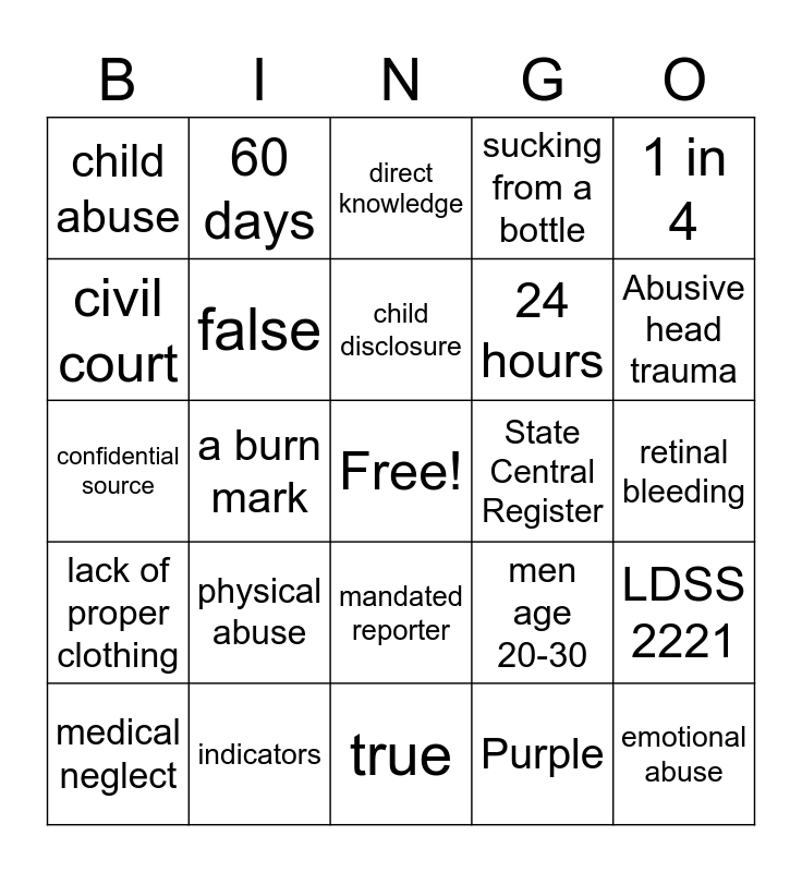 This bingo card has a free space and 24 words: physical abuse, indicators, child disclosure, medical neglect, 1 in 4, child abuse, civil court, 60 days, State Central Register, mandated reporter, 24 hours, confidential source, men age 20-30, LDSS 2221, false, Purple, retinal bleeding, direct knowledge, Abusive head trauma, a burn mark, emotional abuse, lack of proper clothing, sucking from a bottle and true.