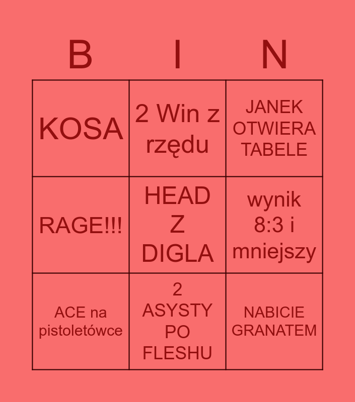 This bingo card has a free space and 8 words: wynik 8:3 i mniejszy, JANEK OTWIERA TABELE, 2 Win z rzędu, ACE na pistoletówce, KOSA, NABICIE GRANATEM, RAGE!!! and 2 ASYSTY PO FLESHU.