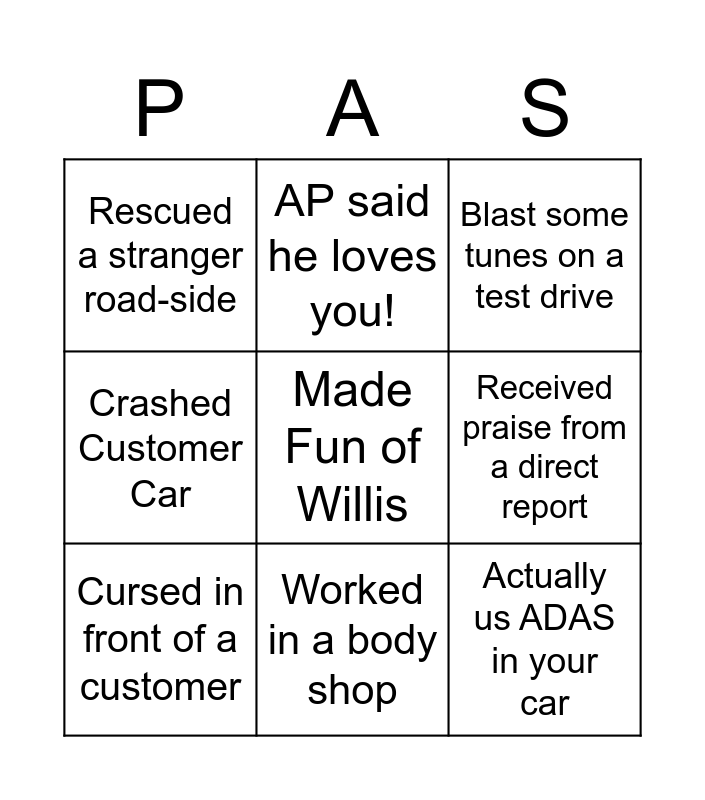 This bingo card has a free space and 11 words: Lost a Customers Keys, Worked in a body shop, Actually us ADAS in your car, Cursed in front of a customer, AP said he loves you!, Blast some tunes on a test drive, Received praise from a direct report, Used the bathroom during a meeting, Crashed Customer Car, Rescued a stranger road-side and Slept in and missed a meeting.