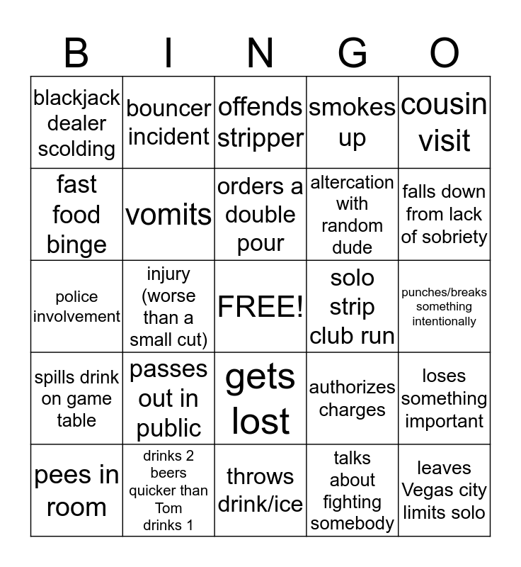 This bingo card has a free space and 24 words: passes out in public, drinks 2 beers quicker than Tom drinks 1, orders a double pour, pees in room, cousin visit, blackjack dealer scolding, fast food binge, bouncer incident, solo strip club run, gets lost, altercation with random dude, police involvement, authorizes charges, loses something important, vomits, talks about fighting somebody, punches/breaks something intentionally, offends stripper, falls down from lack of sobriety, injury (worse than a small cut), leaves Vegas city limits solo, spills drink on game table, smokes up and throws drink/ice.
