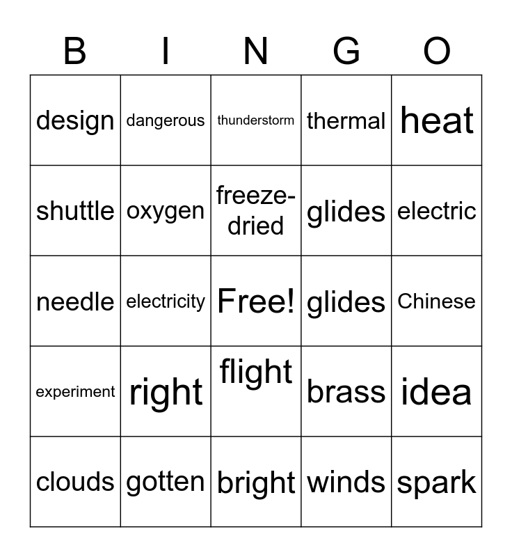 This bingo card has a free space and 35 words: space, cruise, life-support, oxygen, flight, thermal, shuttle, poking, freeze-dried, frozen, needle, heat, fright, kites, design, glides, winds, electricity, experiment, spark, brass, clouds, idea, gotten, thunderstorm, electric, wires, tails, glides, Chinese, vitamin, bright, right, dangerous and tried.