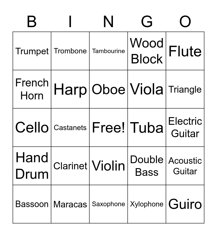 This bingo card has a free space and 25 words: Clarinet, Saxophone, Oboe, Bassoon, Flute, Trumpet, French Horn, Trombone, Tuba, Violin, Viola, Cello, Double Bass, Acoustic Guitar, Harp, Piano, Electric Guitar, Tambourine, Triangle, Castanets, Guiro, Maracas, Hand Drum, Wood Block and Xylophone.