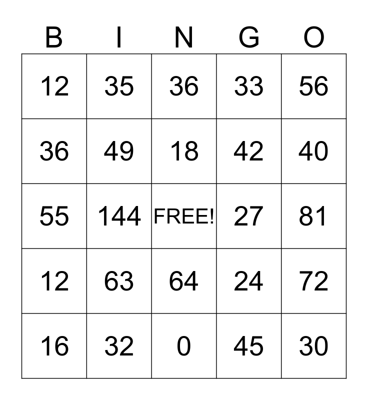 This bingo card has a free space and 24 words: 63, 32, 18, 16, 56, 12, 36, 35, 27, 64, 42, 55, 24, 72, 49, 45, 81, 36, 40, 144, 30, 12, 33 and 0.