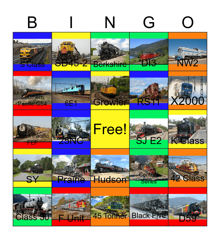This bingo card has 24 images, a free space and 24 words: Prairie, F Unit, Growler, Class 30, NW2, S Class, Southern Pacific GS4, SD45-2, SJ E2, Hudson, RS11, Union Pacific FEF, Century Series, 42 Class, 6E1, Black Five, K Class, Berkshire, X2000, 25NC, D59, SY, DI3 and 45 Tonner.