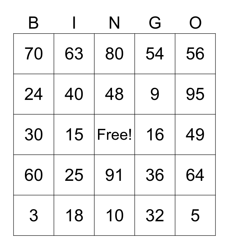 This bingo card has a free space and 24 words: 25, 18, 48, 3, 56, 70, 24, 63, 16, 91, 9, 30, 36, 64, 40, 32, 49, 80, 95, 15, 5, 60, 54 and 10.