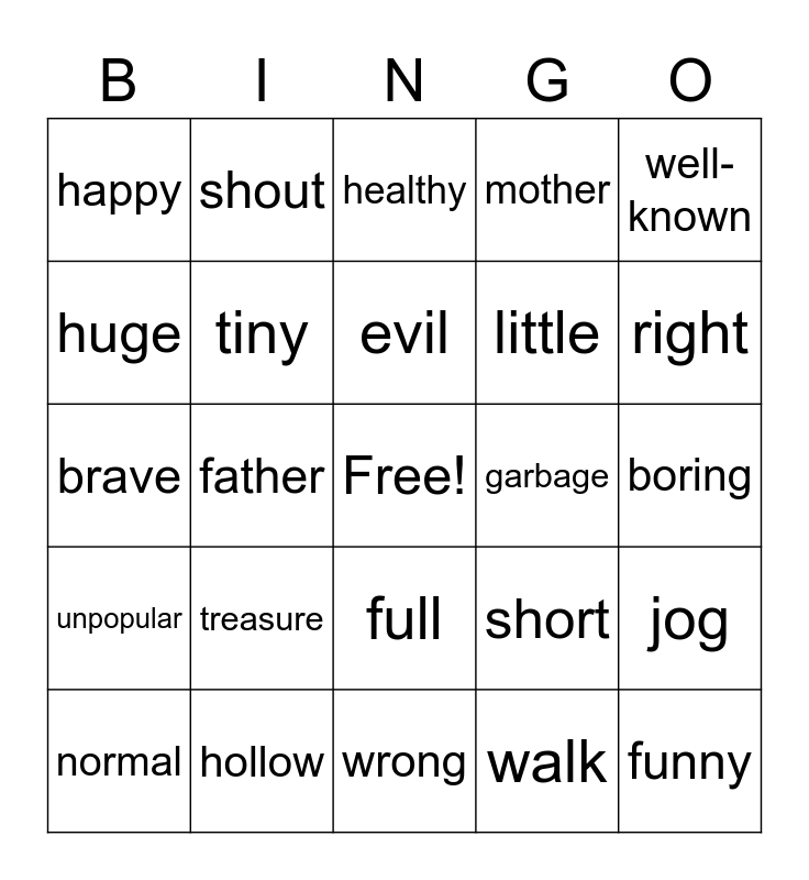 This bingo card has a free space and 40 words: afraid, brave, big, tiny, hollow, full, evil, good, well-known, unpopular, father, mother, funny, boring, garbage, treasure, gloomy, happy, ill, healthy, jog, walk, little, huge, mad, sad, tidy, messy, quick, slow, strange, normal, tall, short, right, wrong, above, below, shout and whisper.