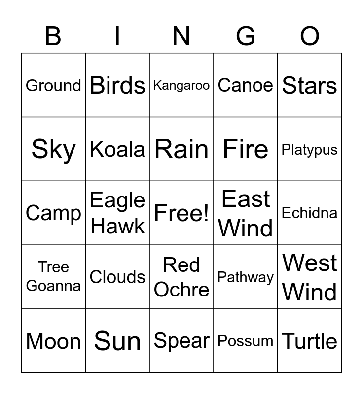 This bingo card has a free space and 24 words: Clouds, Sun, Rain, Moon, Stars, Ground, Sky, Birds, East Wind, Red Ochre, Fire, Camp, Pathway, West Wind, Koala, Possum, Echidna, Kangaroo, Platypus, Eagle Hawk, Turtle, Tree Goanna, Canoe and Spear.