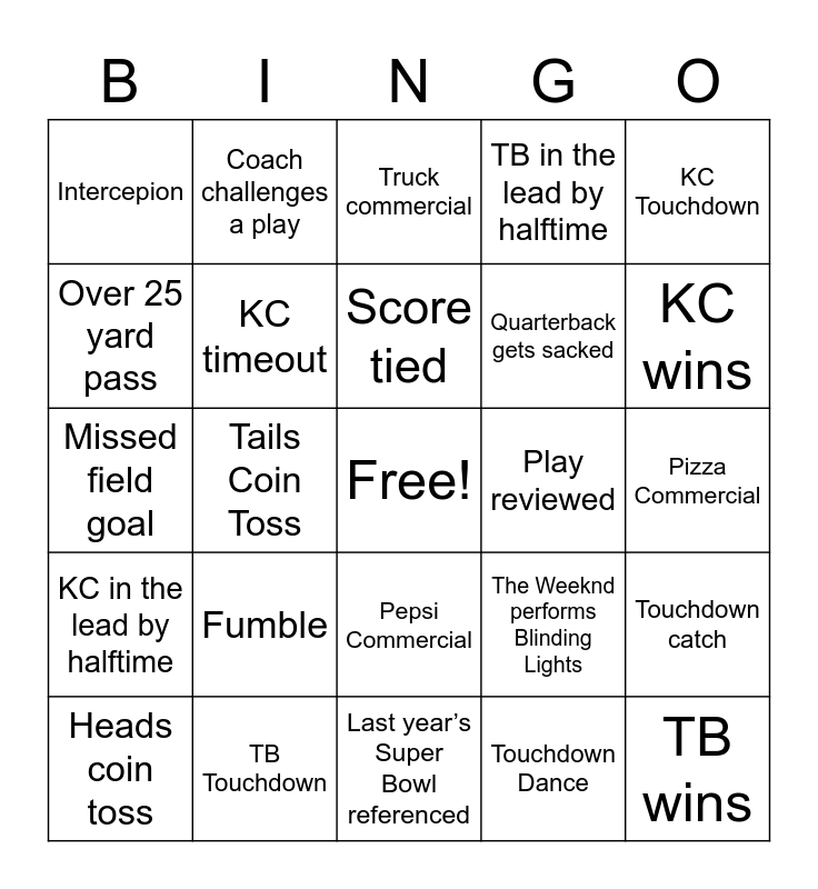 This bingo card has a free space and 26 words: Pepsi Commercial, Touchdown Dance, Score tied, TB Touchdown, KC Touchdown, Intercepion, Over 25 yard pass, Coach challenges a play, Pizza Commercial, The Weeknd performs Blinding Lights, Quarterback gets sacked, Missed field goal, Touchdown catch, Heads coin toss, Tails Coin Toss, Flag thrown on a play, TB in the lead by halftime, KC in the lead by halftime, Truck commercial, TB wins, KC wins, Last year’s Super Bowl referenced, Play reviewed, Fumble, KC timeout and TB timeout.