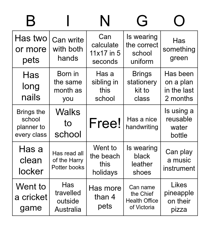 This bingo card has a free space and 24 words: Has read all of the Harry Potter books, Has travelled outside Australia, Has a sibling in this school, Went to a cricket game, Has something green, Has two or more pets, Has long nails, Can write with both hands, Has a nice handwriting, Went to the beach this holidays, Brings stationery kit to class, Brings the school planner to every class, Is wearing black leather shoes, Can play a music instrument, Born in the same month as you, Can name the Chief Health Office of Victoria, Is using a reusable water bottle, Can calculate 11x17 in 5 seconds, Has been on a plan in the last 2 months, Walks to school, Likes pineapple on their pizza, Has a clean locker, Is wearing the correct school uniform and Has more than 4 pets.