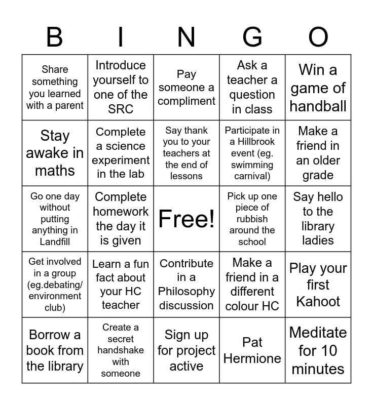 This bingo card has a free space and 24 words: Learn a fun fact about your HC teacher, Create a secret handshake with someone, Say thank you to your teachers at the end of lessons, Borrow a book from the library, Win a game of handball, Share something you learned with a parent, Stay awake in maths, Introduce yourself to one of the SRC, Pick up one piece of rubbish around the school, Contribute in a Philosophy discussion, Participate in a Hillbrook event (eg. swimming carnival), Go one day without putting anything in Landfill, Make a friend in a different colour HC, Play your first Kahoot, Complete a science experiment in the lab, Pat Hermione, Say hello to the library ladies, Pay someone a compliment, Make a friend in an older grade, Complete homework the day it is given, Meditate for 10 minutes, Get involved in a group (eg.debating/ environment club), Ask a teacher a question in class and Sign up for project active.