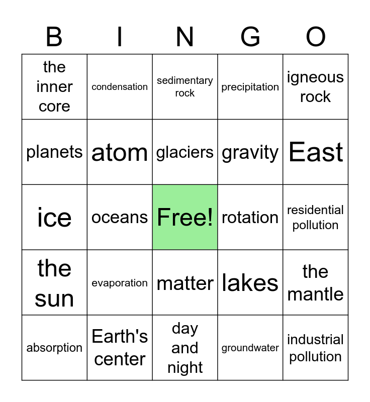 This bingo card has a free space and 24 words: evaporation, Earth's center, glaciers, absorption, igneous rock, the inner core, planets, condensation, rotation, matter, gravity, ice, lakes, the mantle, atom, groundwater, residential pollution, sedimentary rock, East, oceans, industrial pollution, the sun, precipitation and day and night.