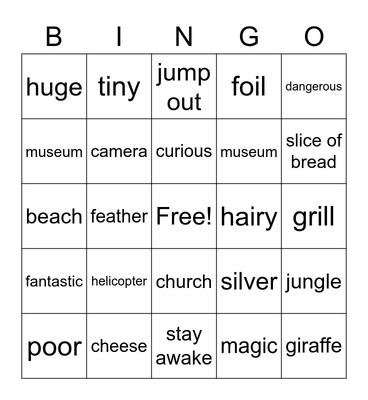 This bingo card has a free space and 40 words: leather, beach, camel, camera, cheese, church, curious, curtain, dangerous, fantastic, feather, foil, giraffe, grill, hairy, helicopter, hide, huge, hurray, jump out, jungle, magic, museum, museum, noise, noisy, olive, oven, owl, peacock, politely, poor, seagull, silver, slice of bread, stay awake, strongest, temple, tiny and weather.