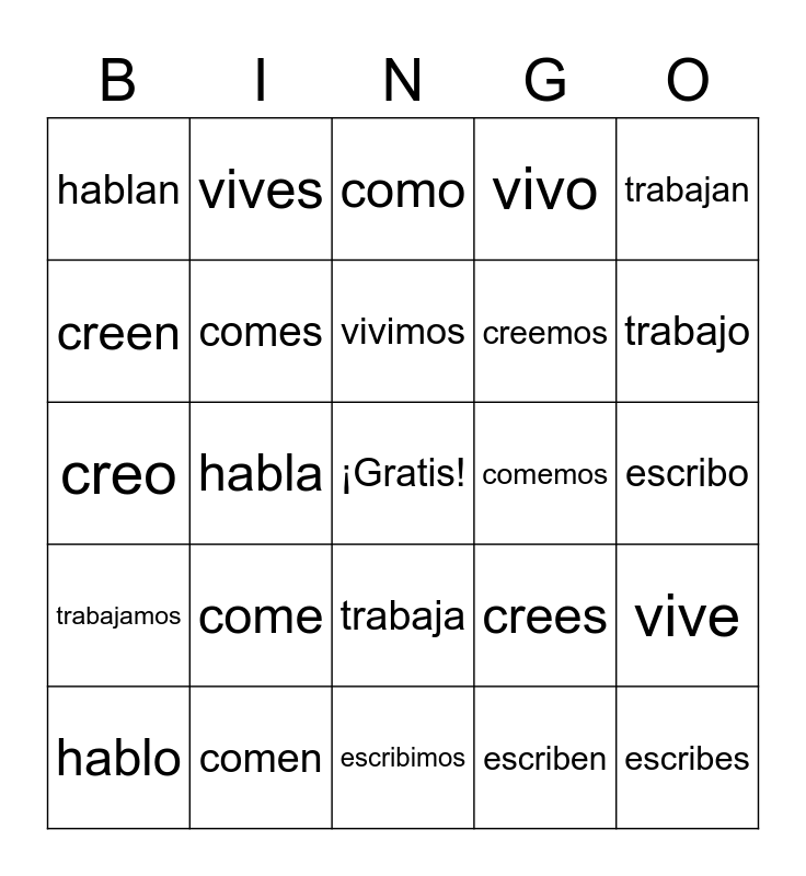 This bingo card has a free space and 29 words: hablo, hablas, habla, hablamos, hablan, como, comes, come, comemos, comen, escribo, escribes, escribimos, escriben, trabajo, trabajas, trabaja, trabajamos, trabajan, creo, crees, cree, creemos, creen, vivo, vives, vive, vivimos and viven.