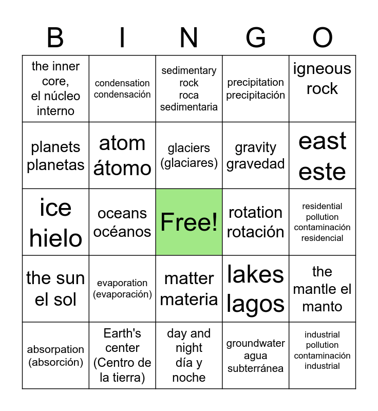 This bingo card has a free space and 24 words: evaporation (evaporación), Earth's center (Centro de la tierra), glaciers (glaciares), absorpation (absorción), igneous rock, the inner core, el núcleo interno, planets planetas, condensation condensación, rotation rotación, matter materia, gravity gravedad, ice hielo, lakes lagos, the mantle el manto, atom átomo, groundwater agua subterránea, residential pollution contaminación residencial, sedimentary rock roca sedimentaria, east este, oceans océanos, industrial pollution contaminación industrial, the sun el sol, precipitation precipitación and day and night día y noche.