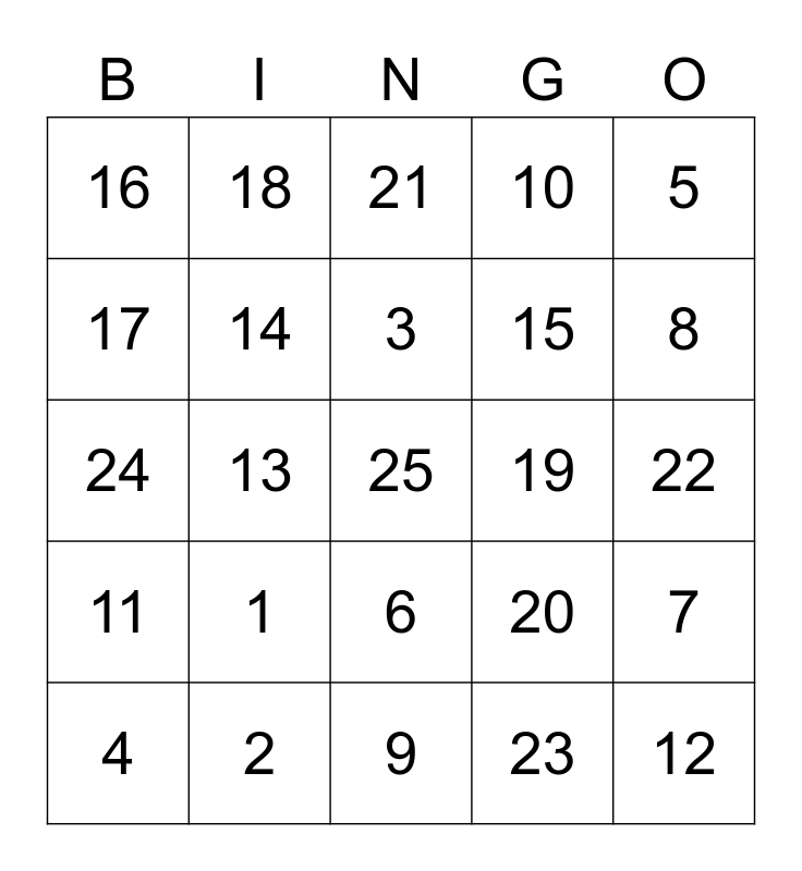 This bingo card has a free space and 24 words: 1, 2, 3, 4, 5, 16, 17, 18, 19, 6, 15, 24, 20, 7, 14, 23, 22, 21, 8, 13, 12, 11, 10 and 9.