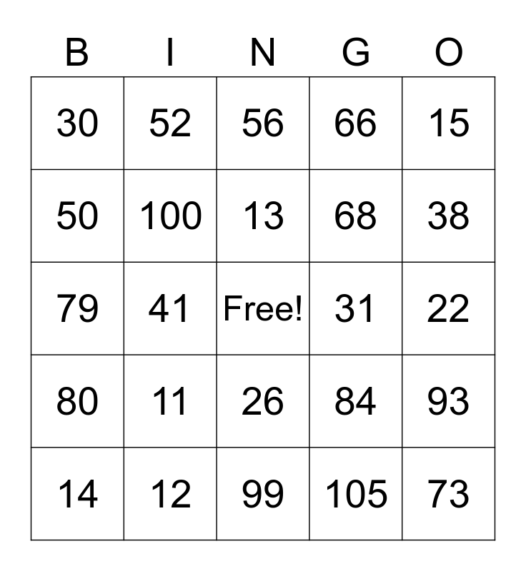 This bingo card has a free space and 24 words: 11, 12, 13, 14, 15, 30, 50, 52, 31, 26, 68, 79, 84, 93, 100, 105, 22, 56, 38, 41, 73, 80, 66 and 99.