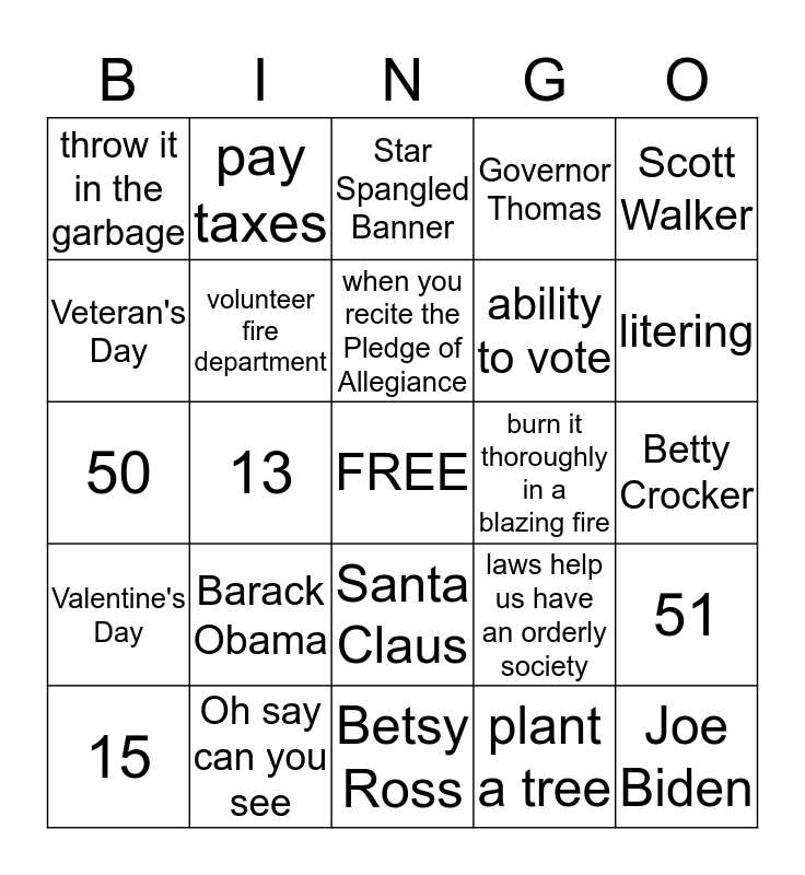 This bingo card has a free space and 24 words: Barack Obama, Oh say can you see, when you recite the Pledge of Allegiance, 15, Scott Walker, throw it in the garbage, Veteran's Day, pay taxes, burn it thoroughly in a blazing fire, Santa Claus, ability to vote, 50, laws help us have an orderly society, 51, volunteer fire department, plant a tree, Betty Crocker, Star Spangled Banner, litering, 13, Joe Biden, Valentine's Day, Governor Thomas and Betsy Ross.