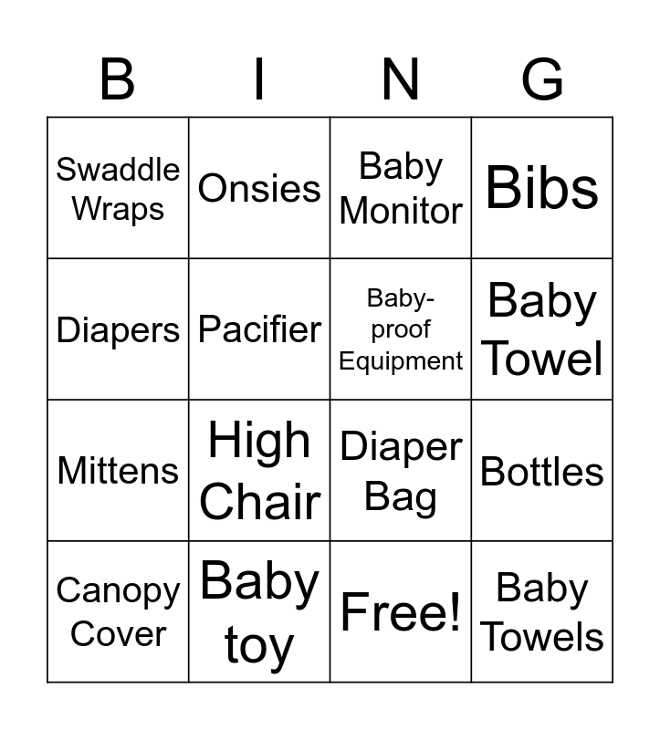 This bingo card has 17 words: Free!, Canopy Cover, Baby Monitor, Swaddle Wraps, High Chair, Bibs, Bottles, Baby-proof Equipment, Baby Towel, Pacifier, Baby toy, Diaper Bag, Diapers, Onsies, Mittens, Socks and Baby Towels.