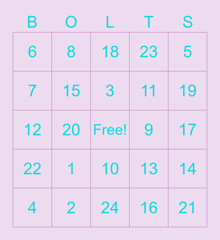 This bingo card has a free space and 24 words: 1, 2, 3, 4, 5, 6, 7, 8, 9, 10, 11, 12, 13, 14, 15, 16, 17, 18, 19, 20, 21, 22, 23 and 24.