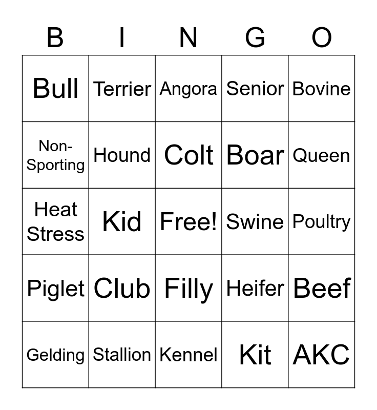 This bingo card has a free space and 46 words: Herding, AKC, American, Kennel, Club, Working, Terrier, Toy, Non-Sporting, Sporting, Hound, Senior, Beef, Heifer, Steer, Gilt, Colt, Swine, Equine, Bovine, Kid, Kit, Bull, Boar, Tom, Queen, Gelding, Wether, Filly, Piglet, Foal, Kitten, Mare, Buck, Doe, Stallion, Poultry, Ewe, Ram, Dutch, Californian, Angora, Heat Stress, Lop, New Zealand and Junior.