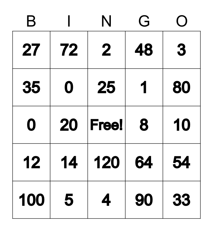 This bingo card has a free space and 24 words: 14, 5, 25, 100, 3, 27, 35, 72, 8, 120, 1, 0, 64, 54, 0, 90, 10, 2, 80, 20, 33, 12, 48 and 4.