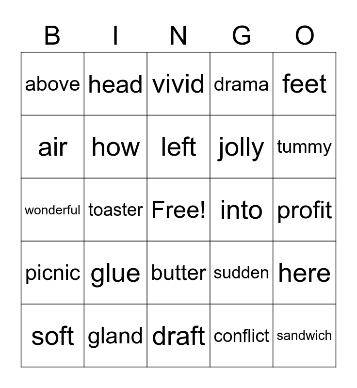This bingo card has a free space and 24 words: glue, gland, left, soft, feet, above, air, head, into, butter, jolly, wonderful, sudden, here, how, conflict, profit, vivid, tummy, toaster, sandwich, picnic, drama and draft.